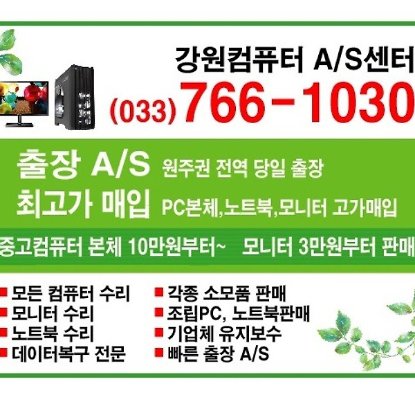 매입센터 원주컴퓨터수리 / 컴퓨터매입 / 컴퓨터판매 ◈ 컴퓨터 판매 / 고가매입 / AS전문점 ◈ 강원컴퓨터 : ☎ 033-766-1030 ★강원컴퓨터★강원컴퓨터출장A/S 033-766-1030 ★컴퓨터매입전문★현금즉시 지급 ★원주컴퓨터판매★원주컴퓨터할인매장 ★원주컴퓨터수리★원주컴퓨터출장A/S 저희 강원컴퓨터출장A/S에서는 강원도 원주 인근지역 원주,원주전지역,문막,횡성등 출장A/S및 신품,중고컴퓨터 판매 매입 노트북 ,모니터 판매 매입 PC,모니터,노트북 수리전문점 항상 저희 강원컴퓨터를 이용해주셔서 감사합니다. 더보기