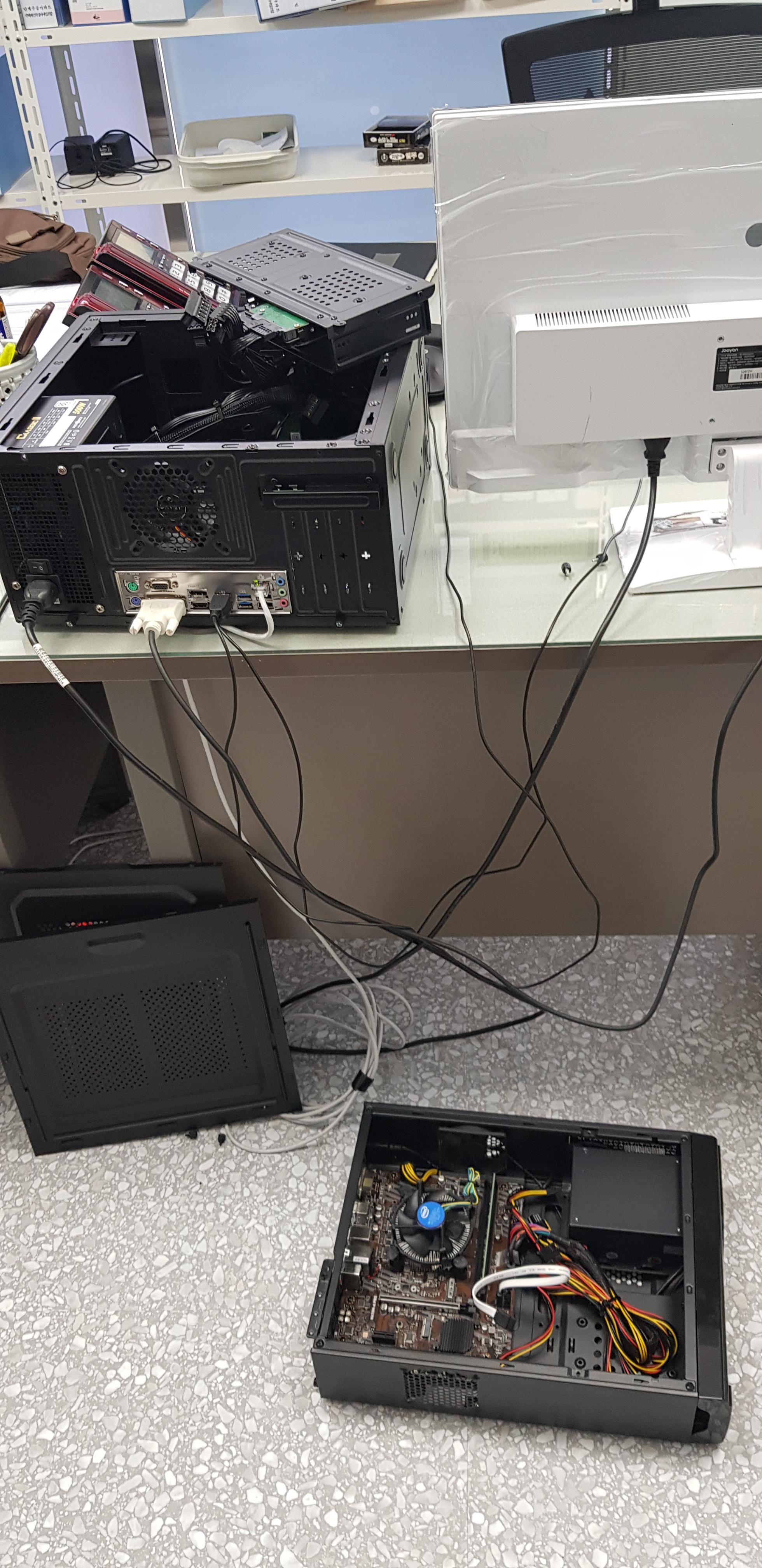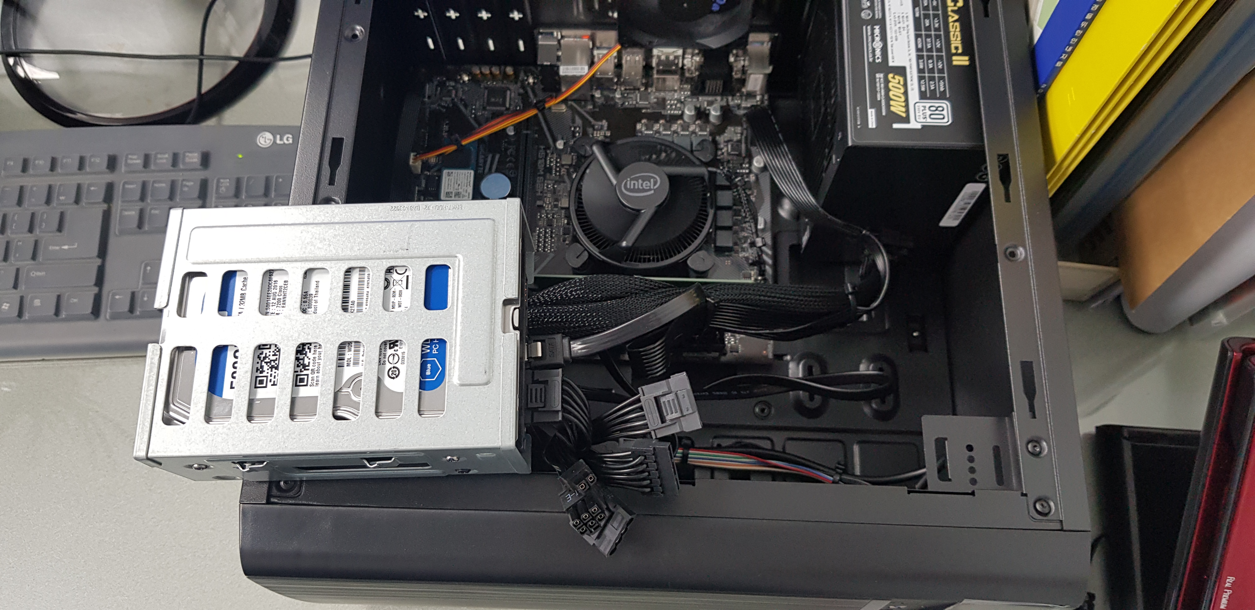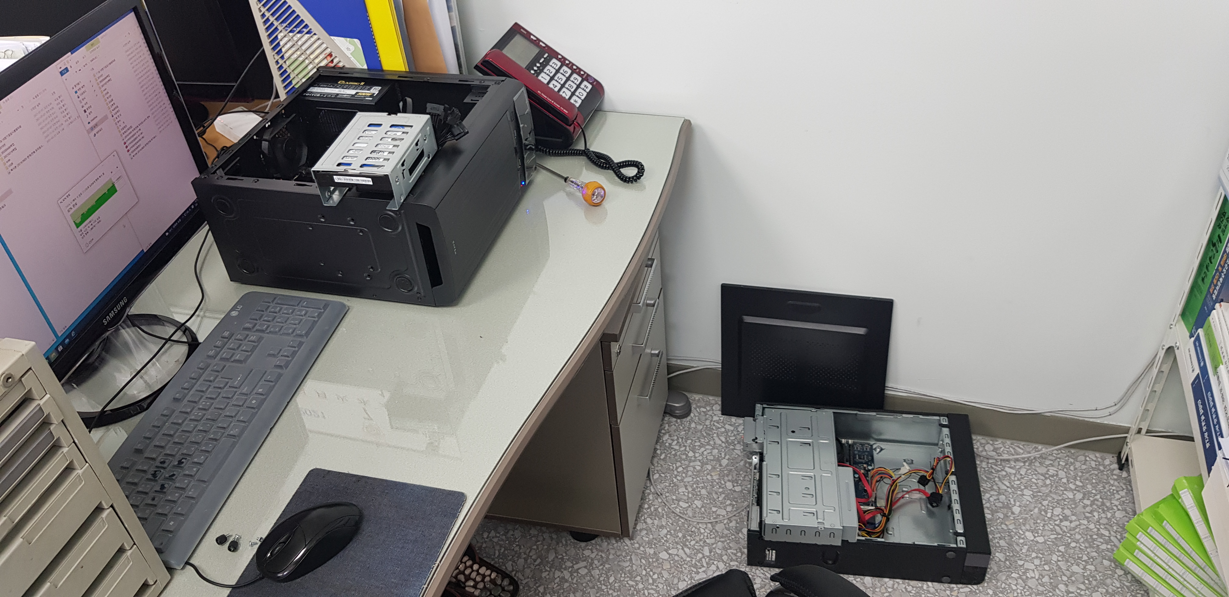 책상 아래 있는 구컴에서 하드디스크를 찾아서 책상 위의 신컴에 연결합니다.