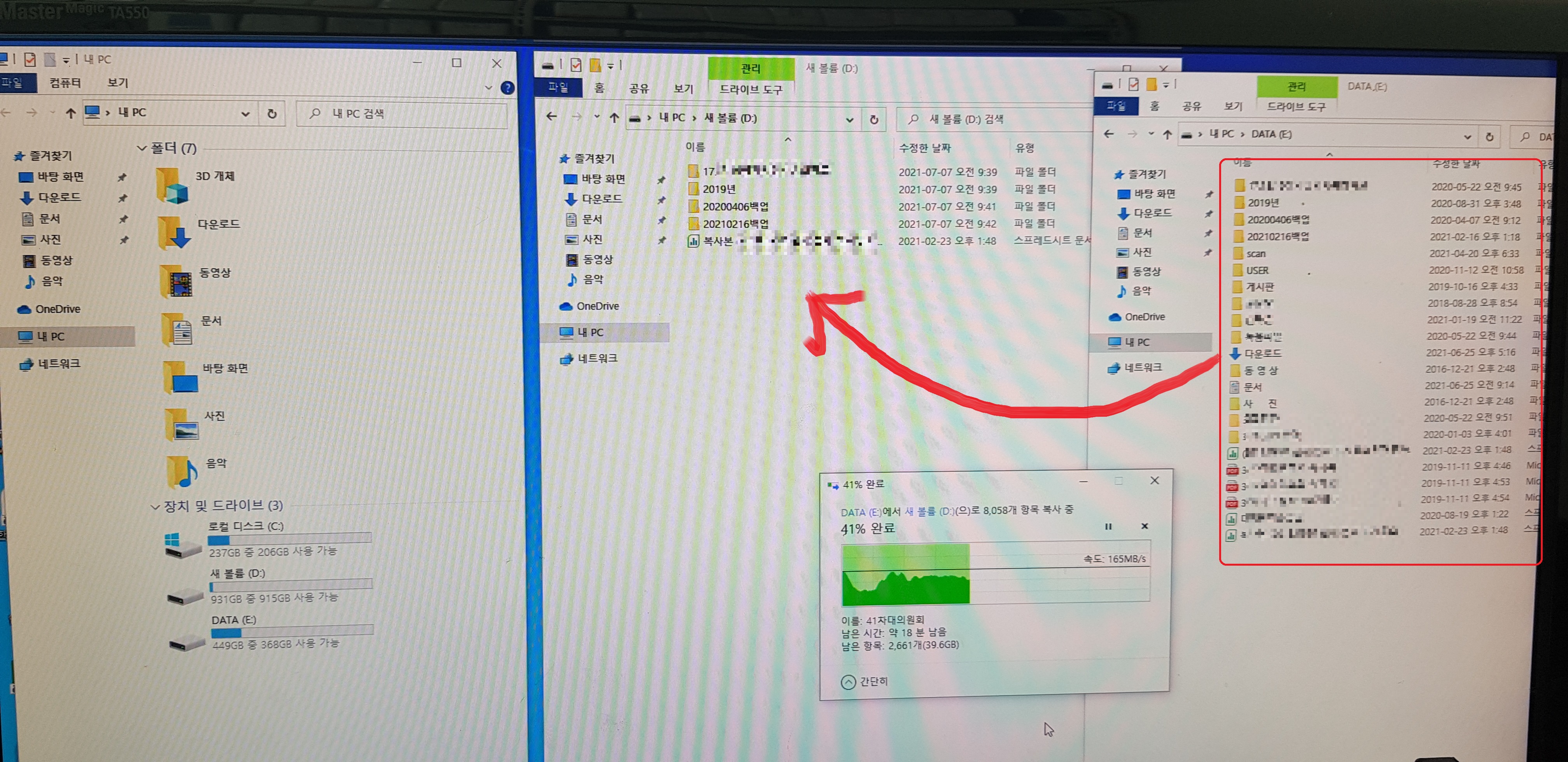 이제 구컴의 자료를 복사해서 신컴의 D:드라이브로 붙여넣기 하면 됩니다.